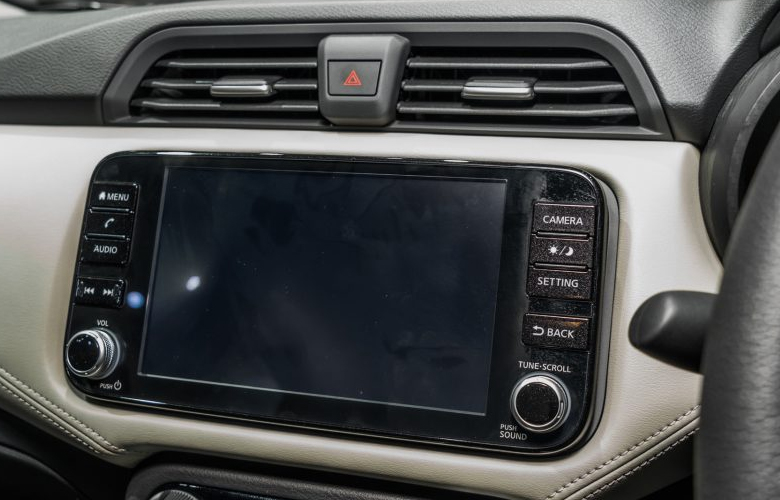 Màn hình trung tâm dạng ẩn được đặt hơi lệch sang phía ghế phụ hơn. Nhìn chung khoang lái của Almera 2022 khá đẹp mắt và đề cao tính thể thao để tạo cảm giác lái xe được phấn khích hơn.