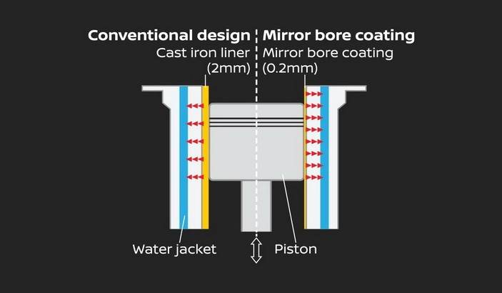 - Công nghệ tráng gương buồng đốt lấy từ GTR mẫu xe đua của Nissan, giúp tiết kiệm nhiên liệu hơn (duy nhất trong phân khúc)