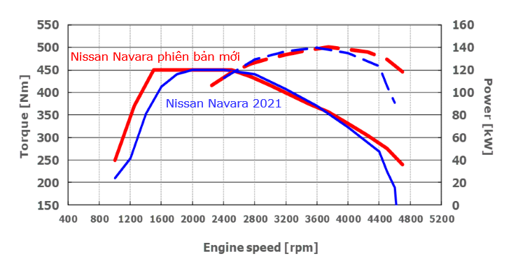 Đường đặc tính của Nissan Navara 2021 (động cơ 2.5L) và Nissan Navara phiên bản mới (động cơ 2.3 Turbo kép)