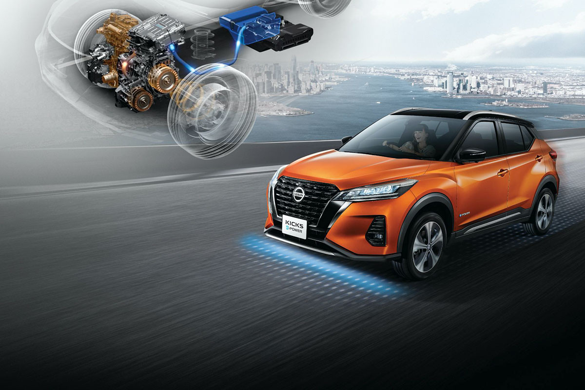"e-POWER” trong tên gọi Nissan Kicks là nhấn mạnh đến hệ thống truyền động điện khí hóa. Nissan Kicks sử dụng động cơ xăng 3 xi-lanh 1.2L nhưng lại không dùng để dẫn động, mà chỉ hoạt động như một máy phát điện để sạc cho cụm pin lithium-ion.